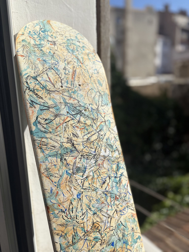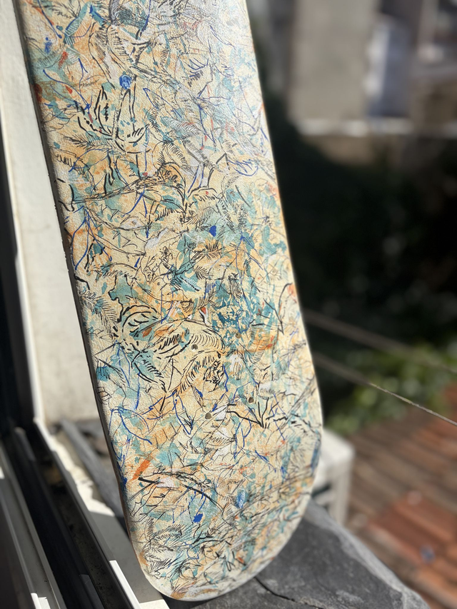 Epoxy protection, ready to be used as decoration or to skate. Mixed technique painting and drawing. Unique piece. 83 x 20 cm.